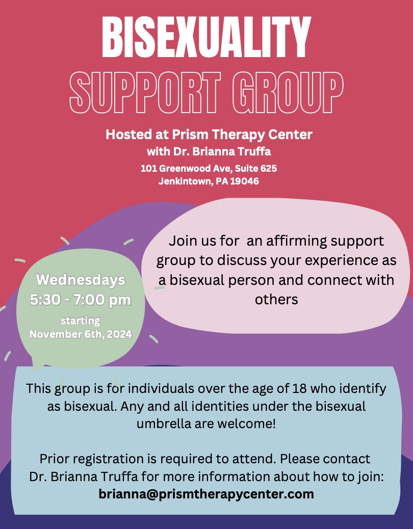 Join Dr Brianna Truffa, PsyD MEd for a weekly support group for anyone who identifies under the bisexual umbrella!